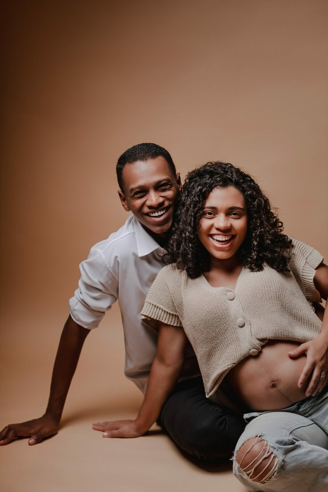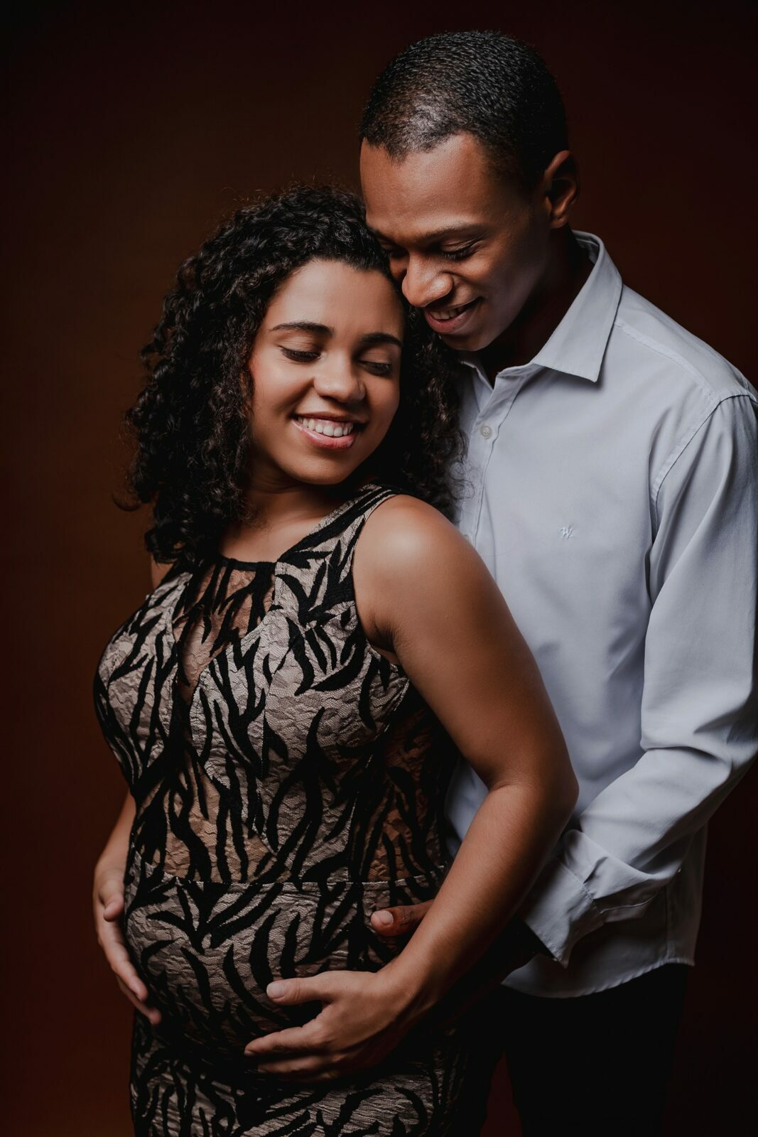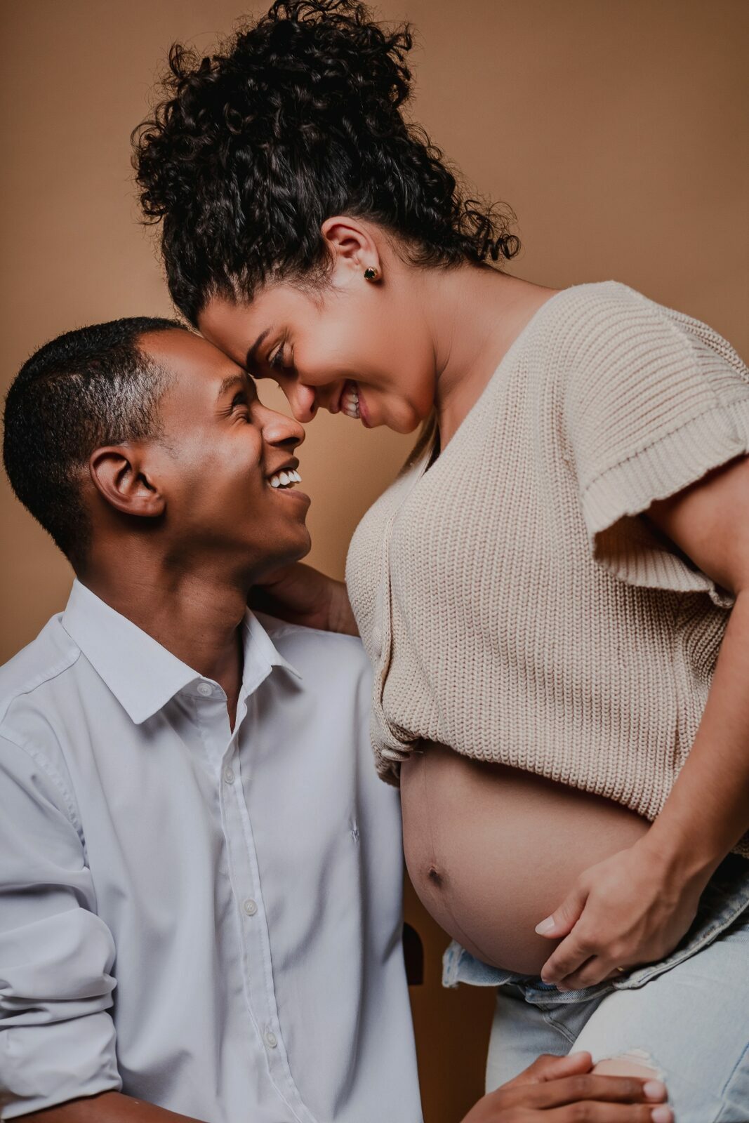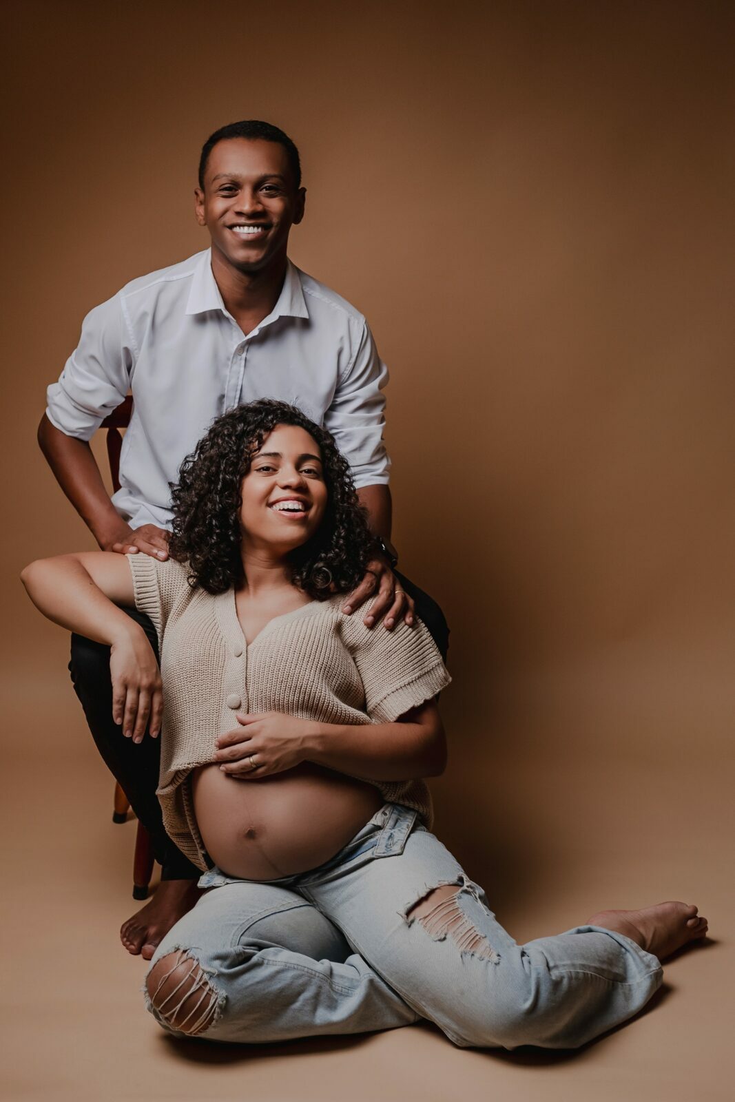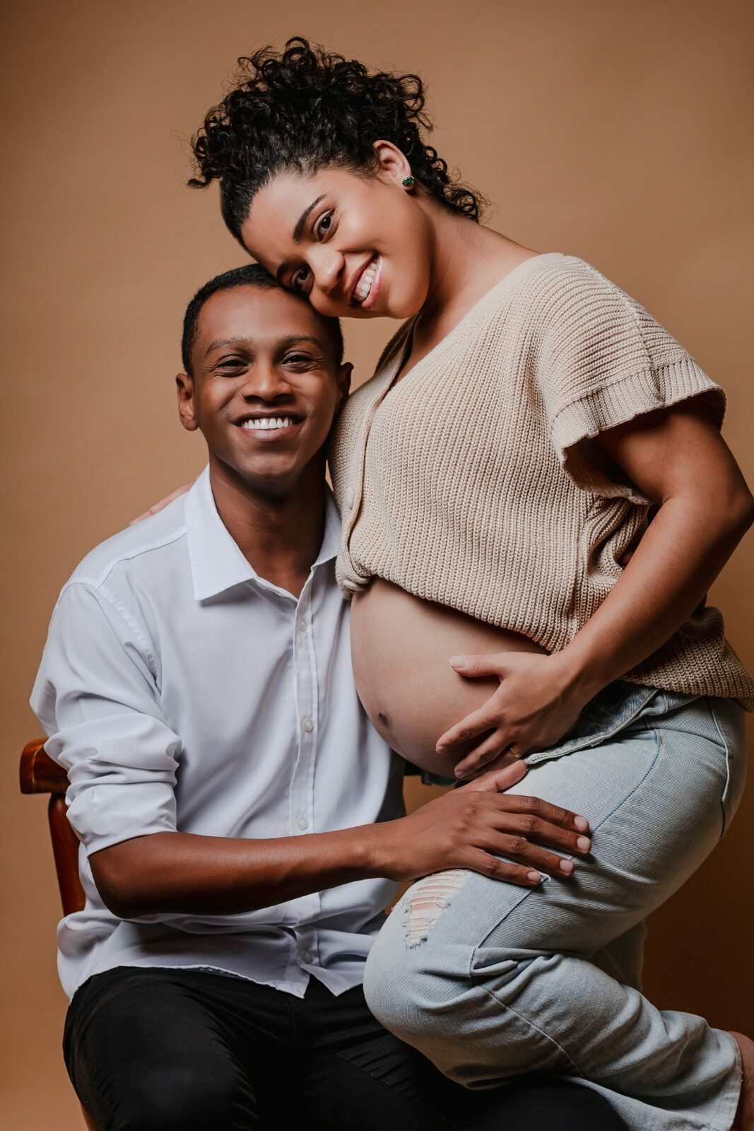 Durante o ensaio fotográfico gestante em estúdio, são valorizados os gestos, os olhares e a proximidade entre Nedina e Jonatas, traduzindo em imagens toda a expectativa e o amor envolvidos na espera pelo bebê.